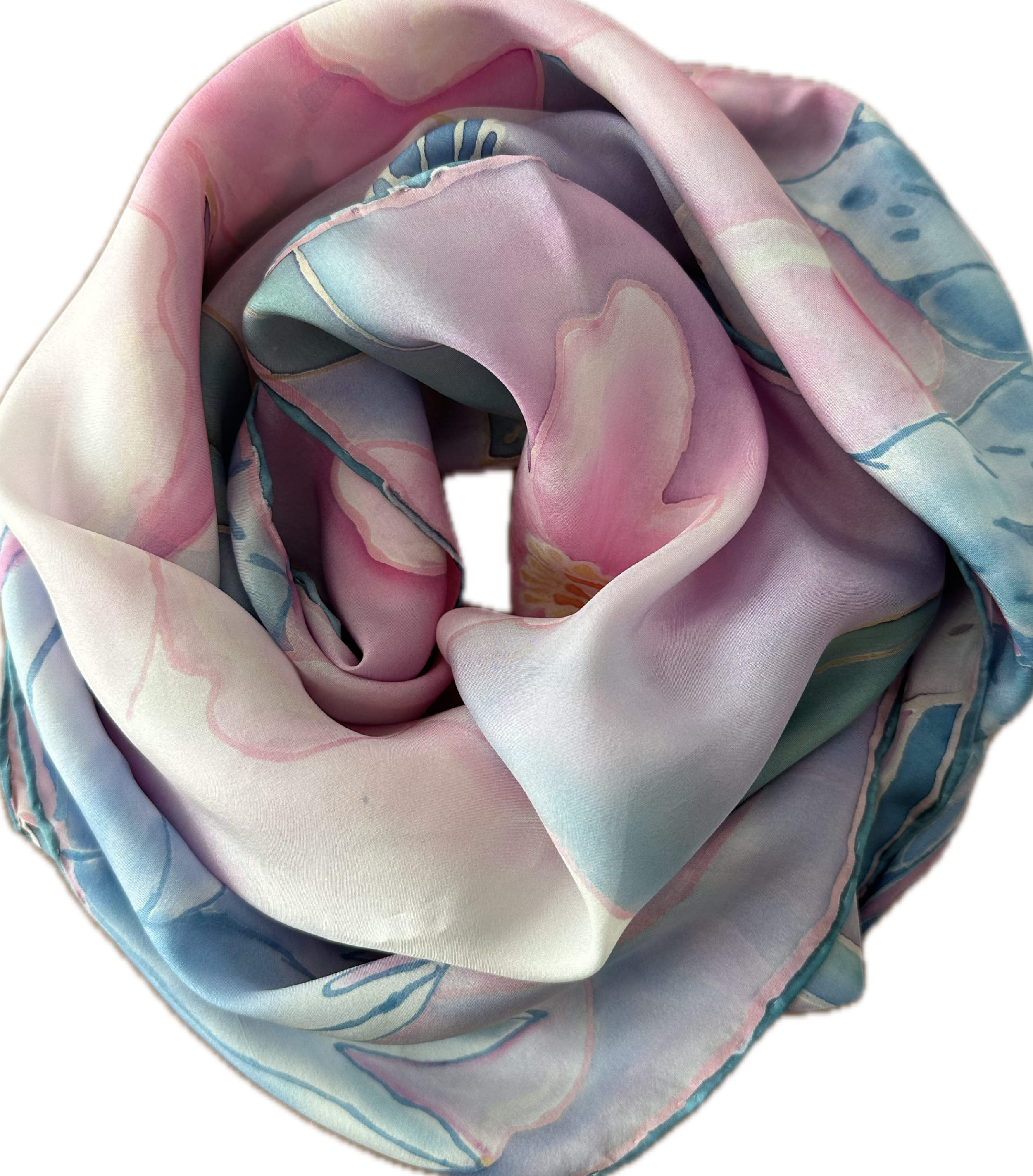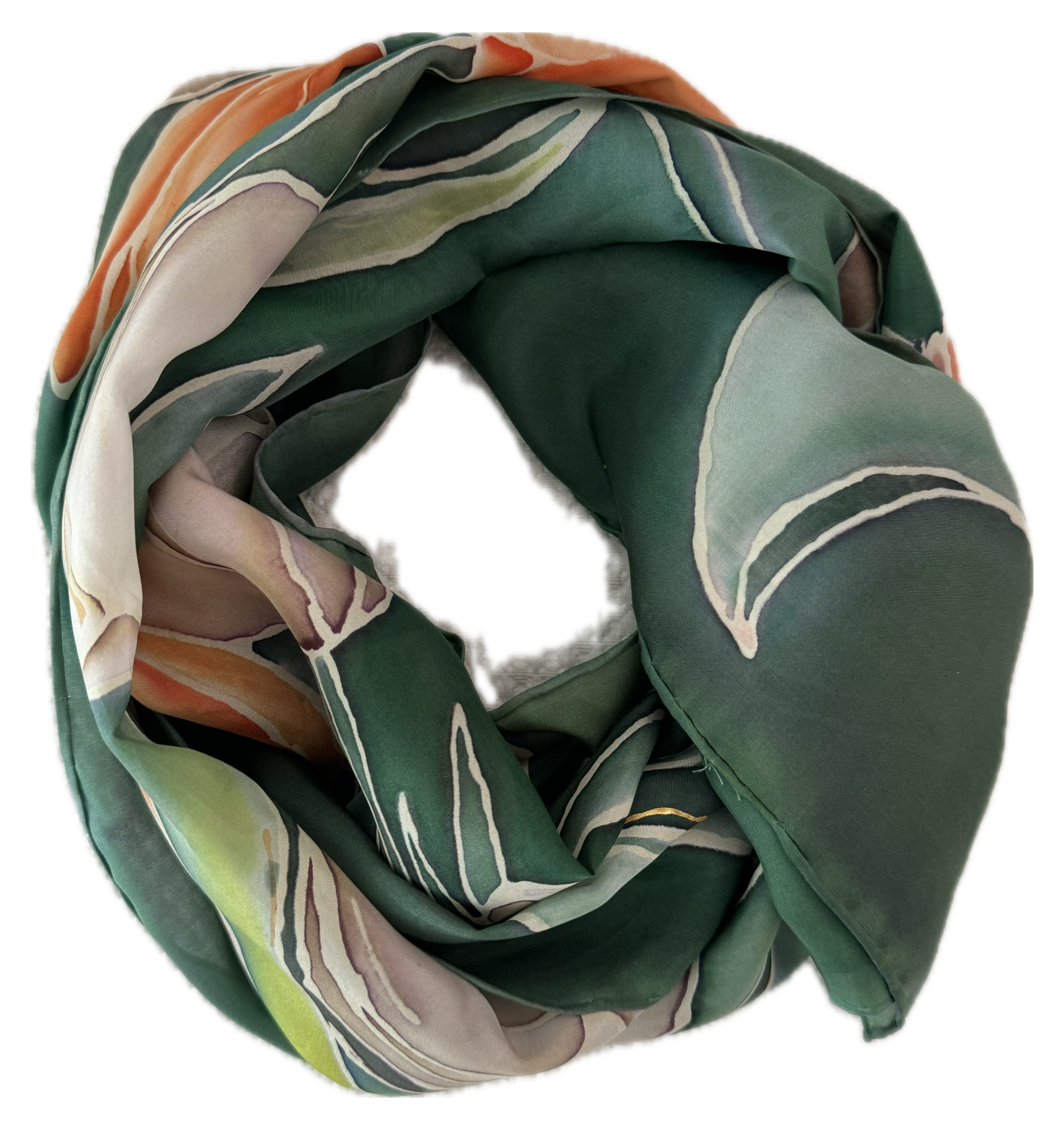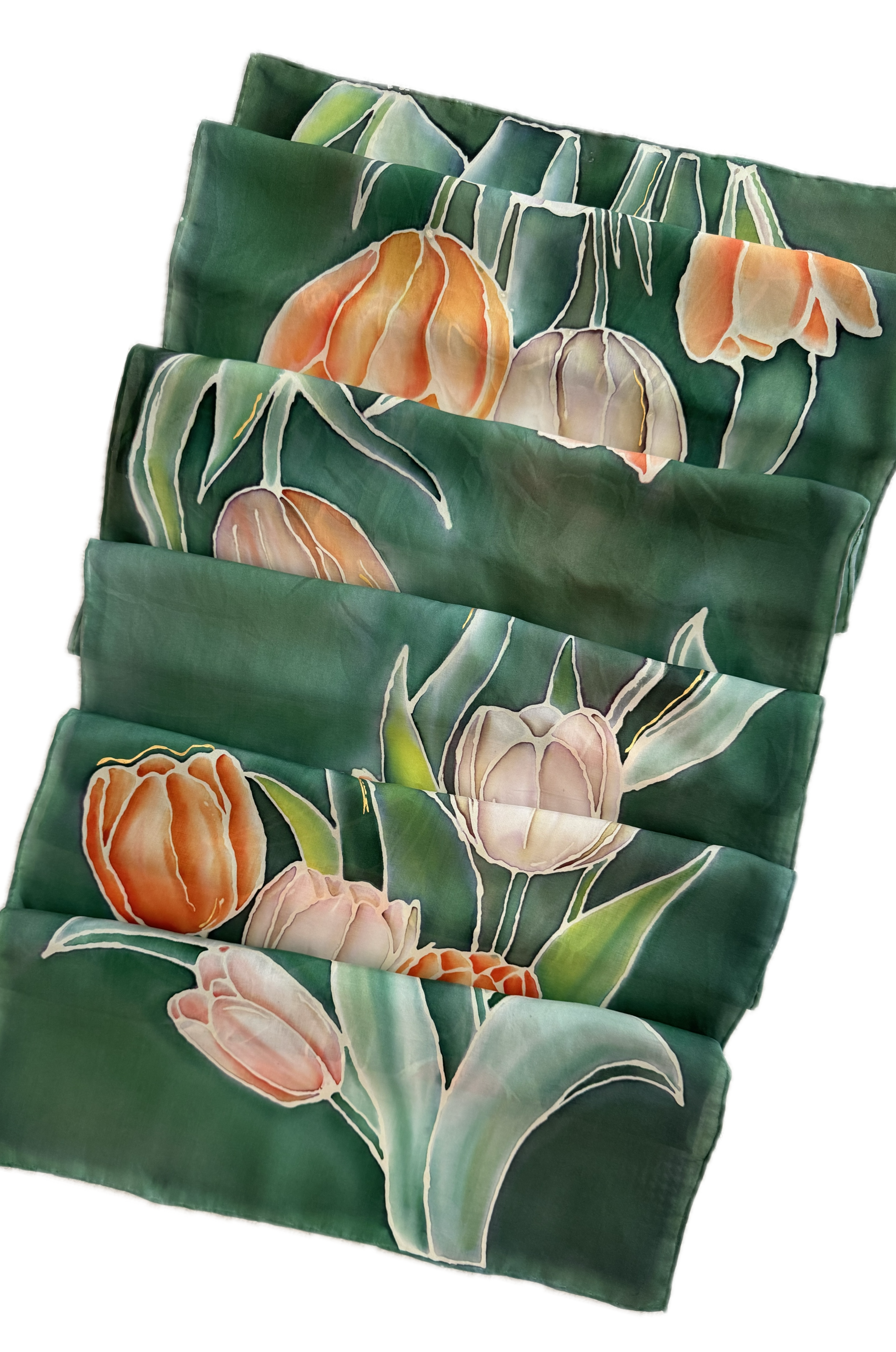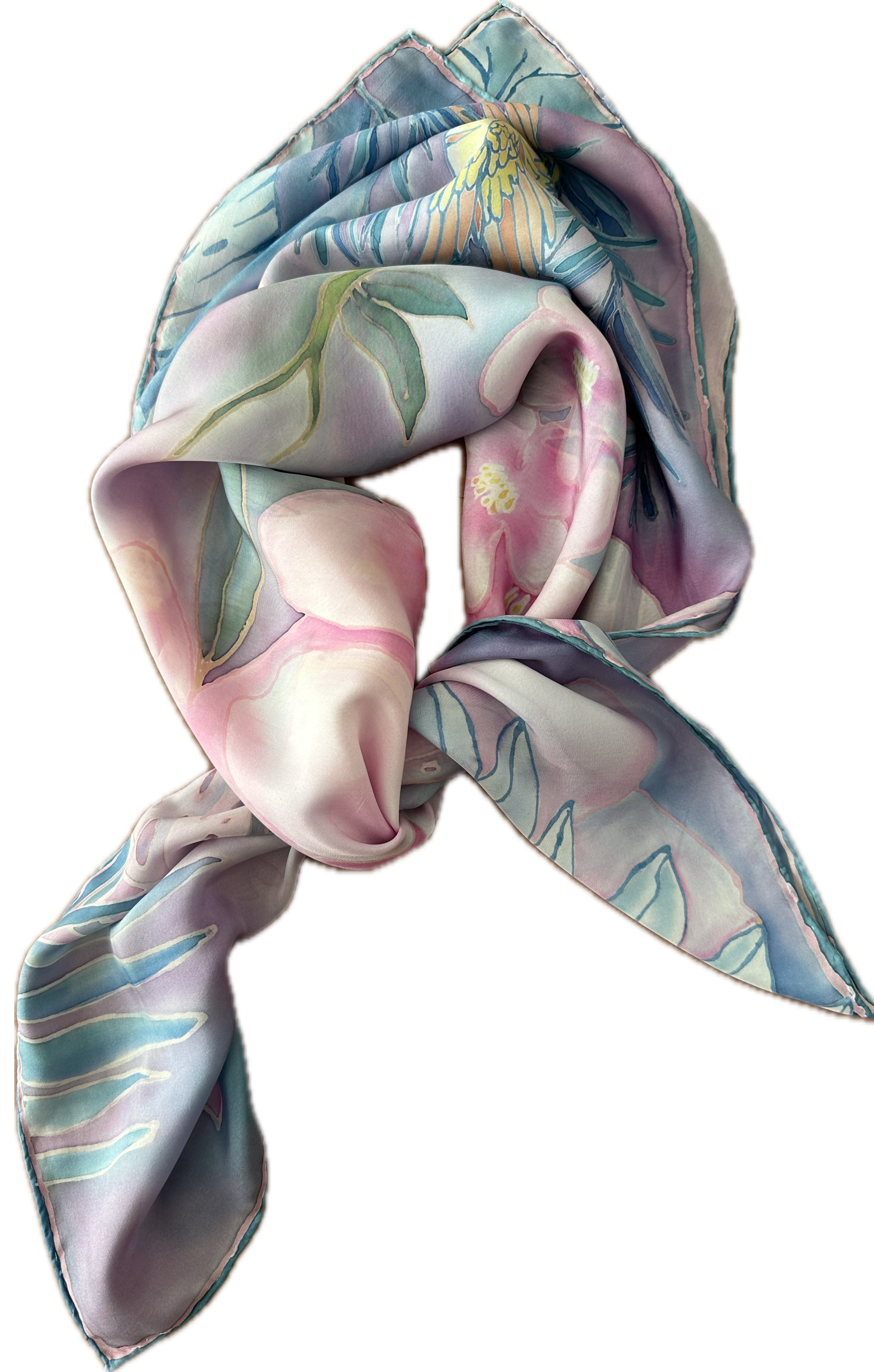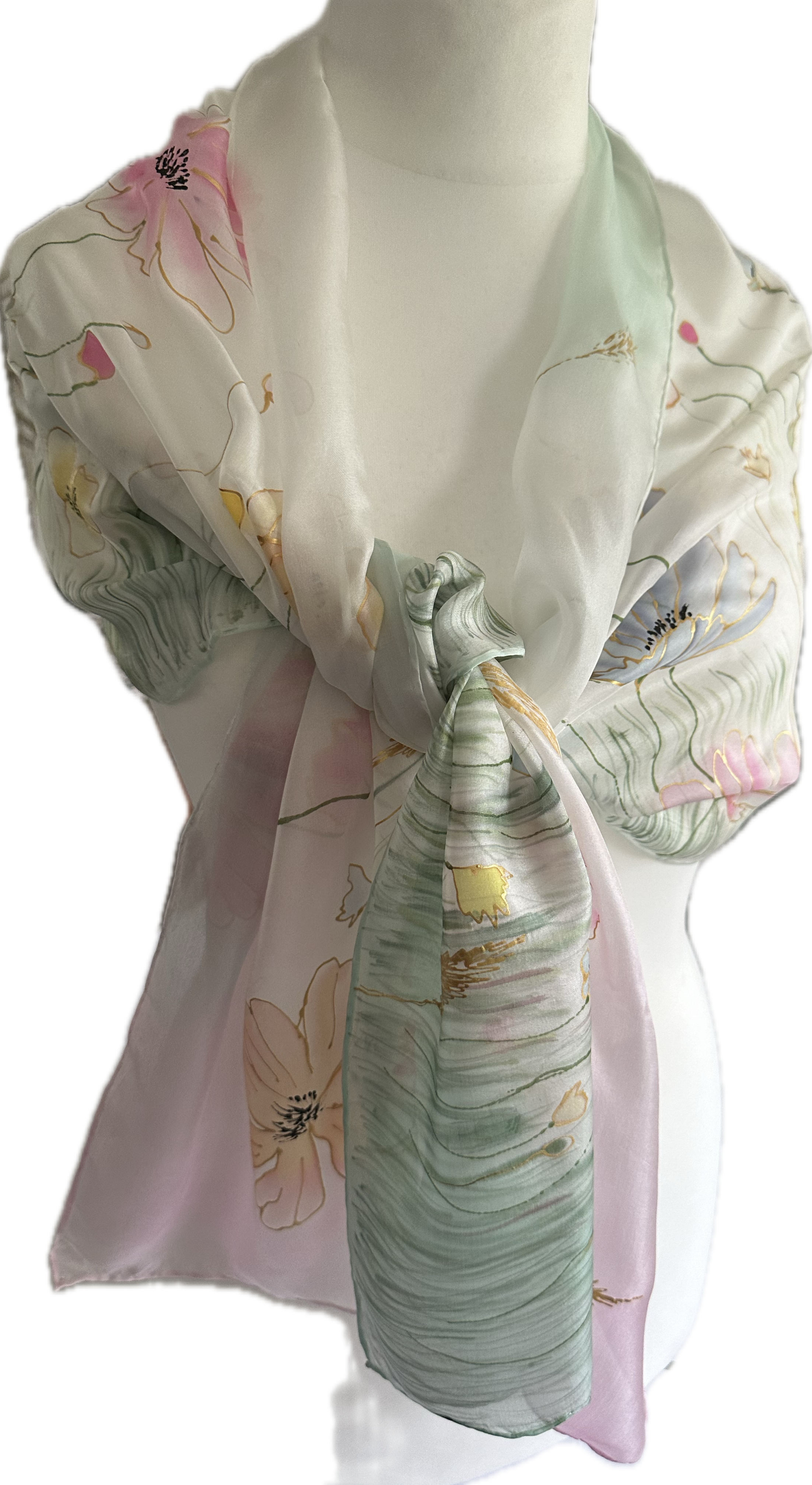 Each silk scarf is carefully hand-painted and made with care, these scarves bring a simple, elegant touch of color and style to any outfit.