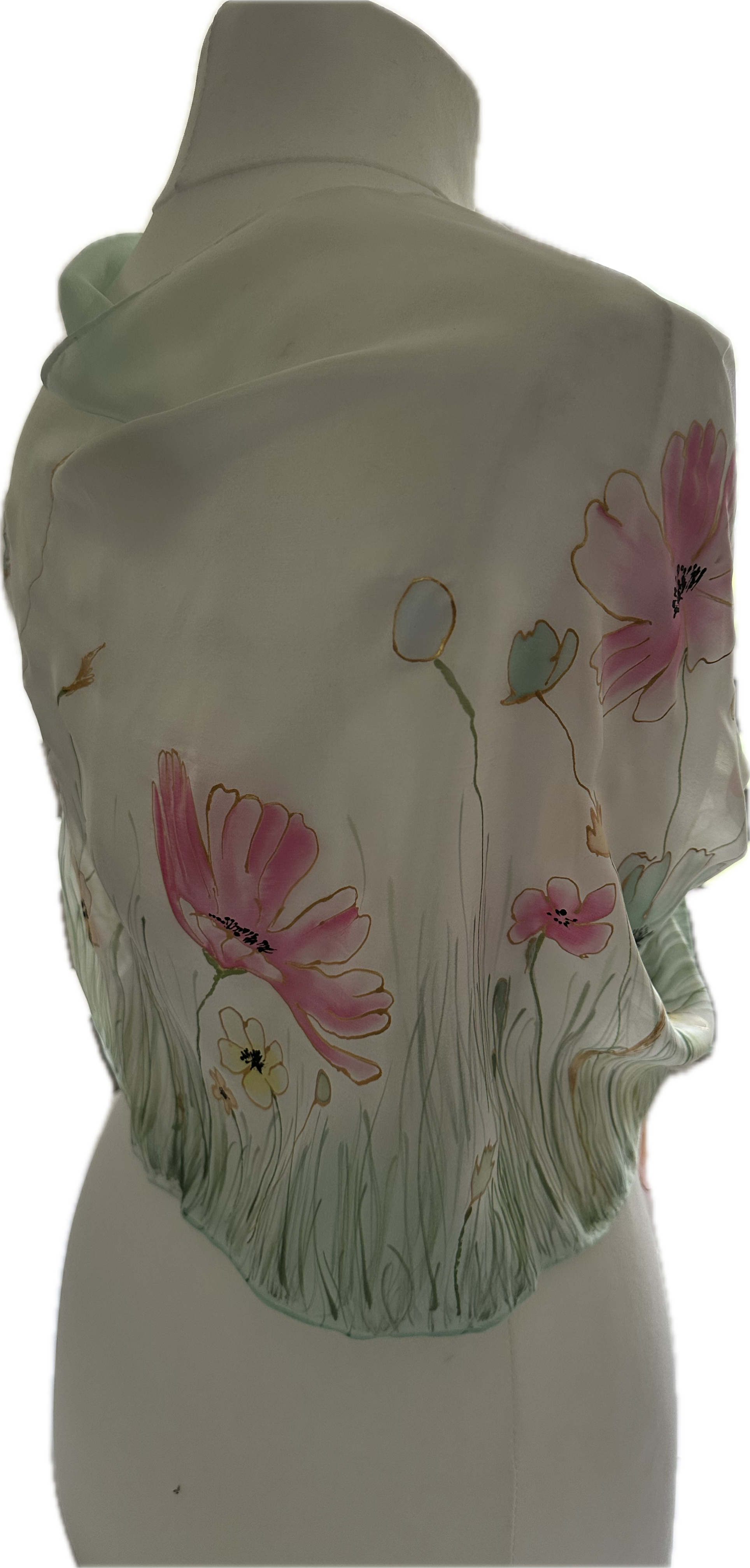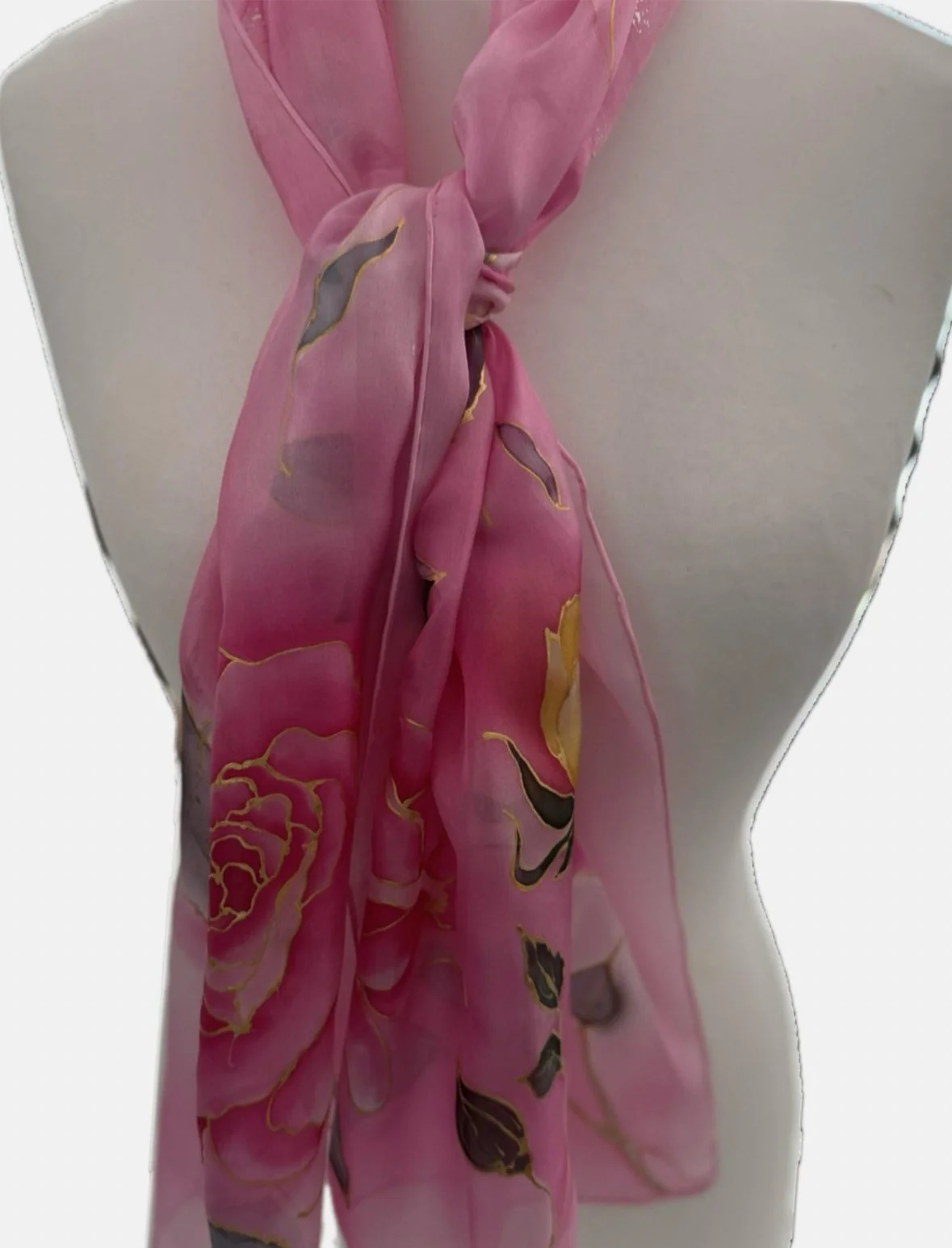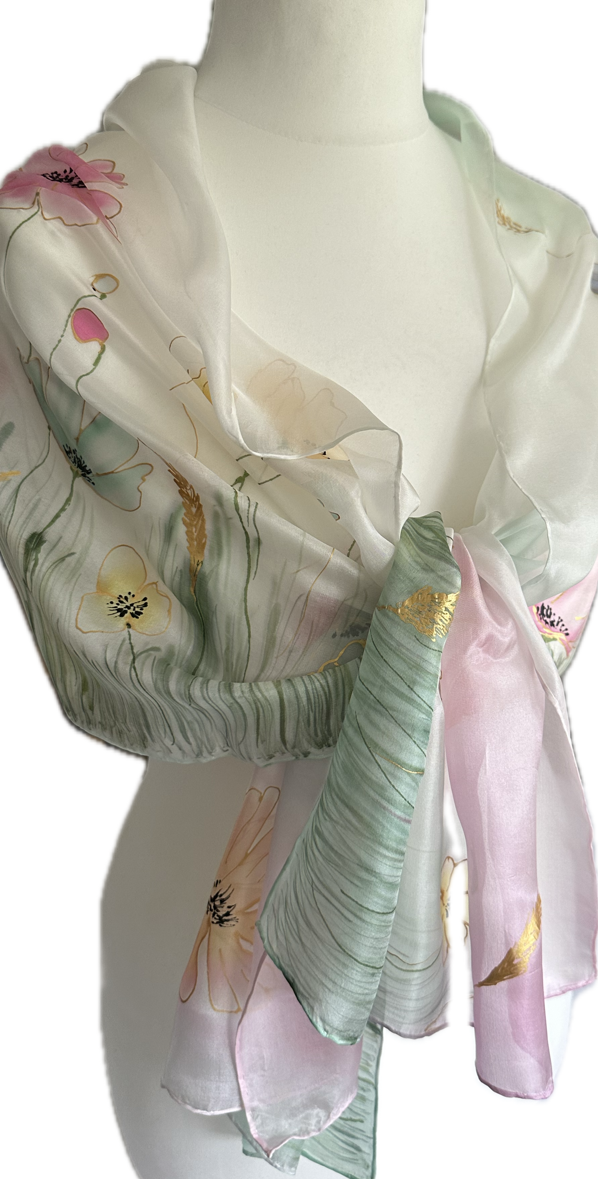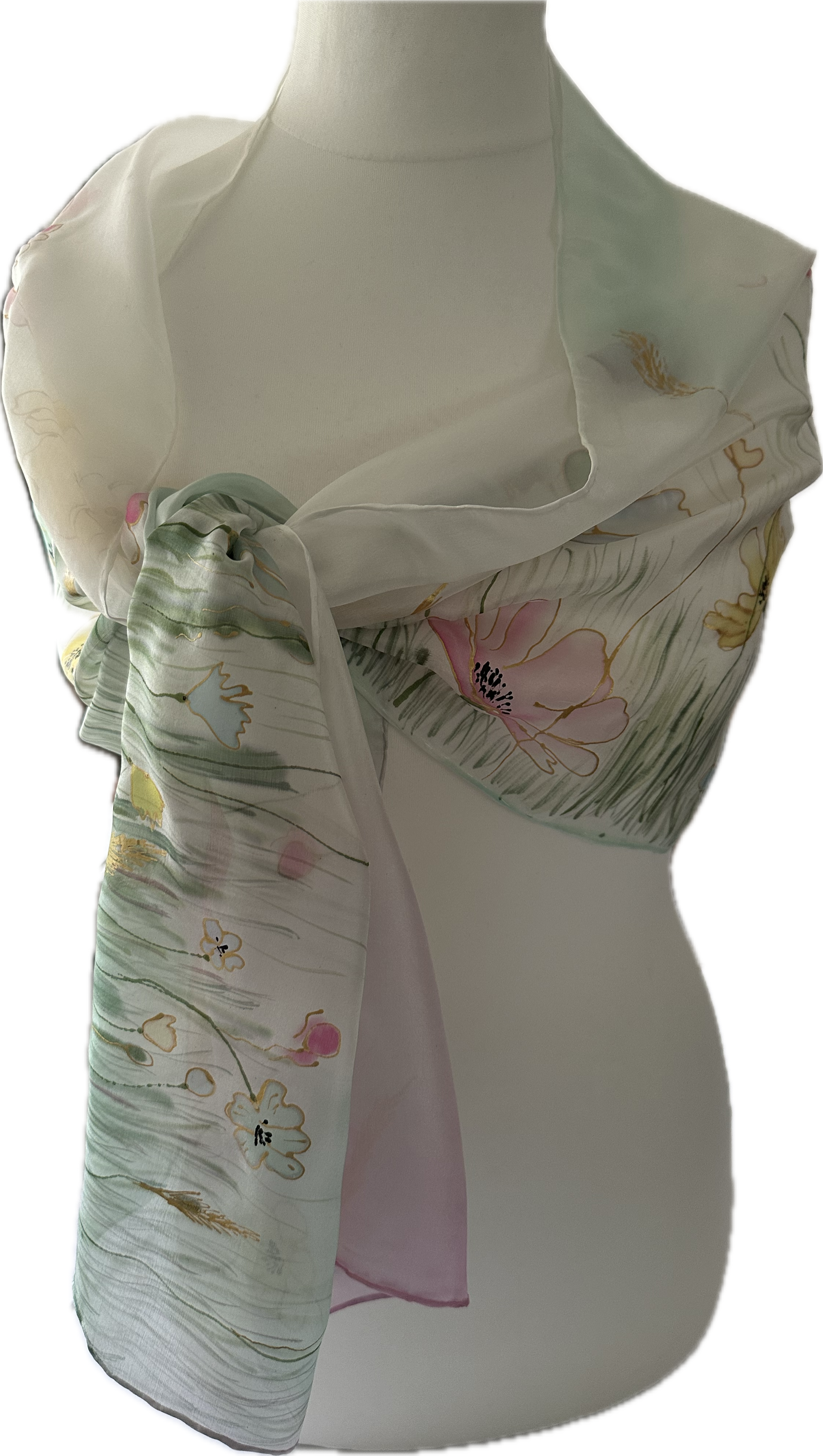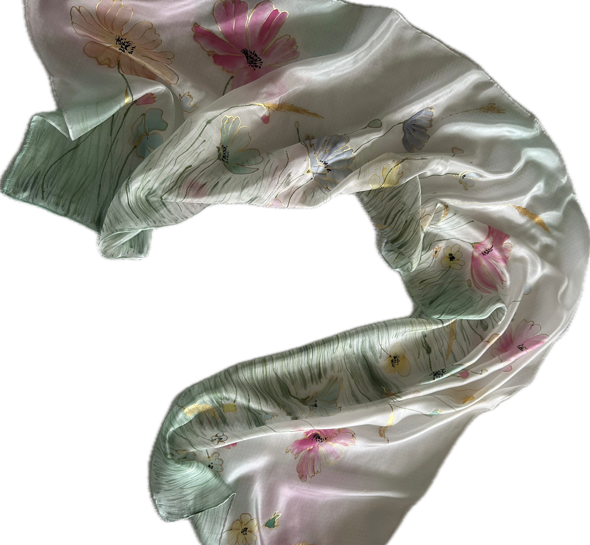 Each silk scarf is carefully hand-painted and made with care, these scarves bring a simple, elegant touch of color and style to any outfit.